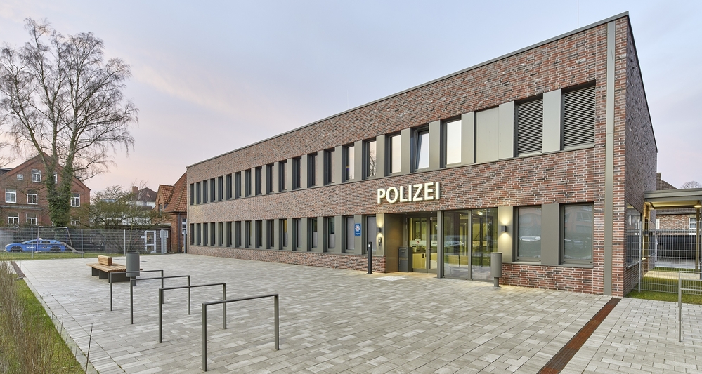 Der zweigeschossige Bau bietet Platz für vier Gewahrsamszellen, Räume für die Anzeigenaufnahme, Blutentnahme und erkennungsdienstliche Behandlung, Büros, einen Waffenraum sowie Sanitärräume und Umkleiden. Das Bauwerk punktet mit Gründach, einer Photovoltaikanlage und ELadesäulen in Sachen Nachhaltigkeit und ist unter anderem durch regionale Fassadenklinker städtebaulich eingebunden.