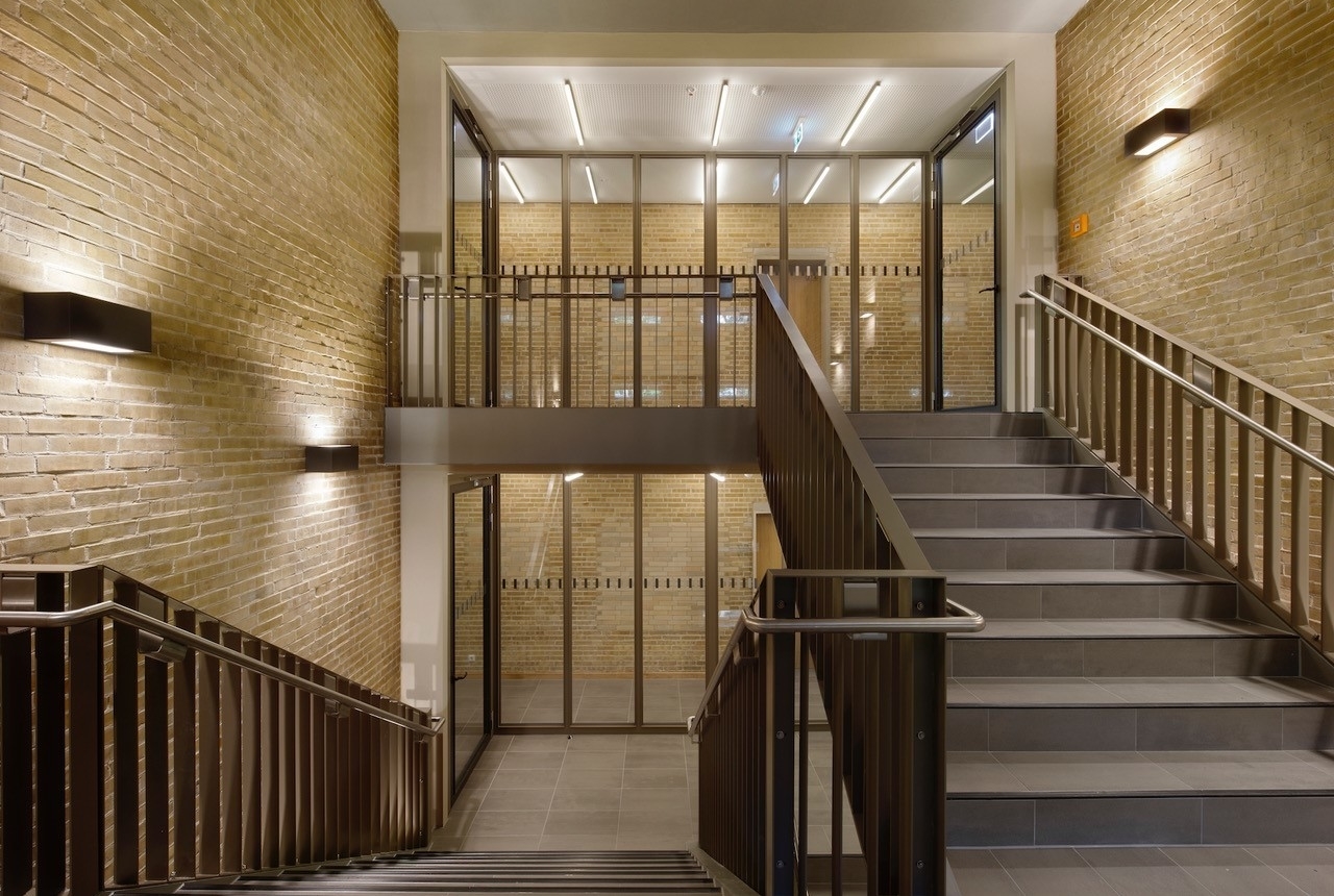 Der Innenbereich erhielt eine optische Aufwertung durch ein neues Farbkonzept. Dabei setzte das Baumanagement auf die Beibehaltung der Materialität der Flure aus gelbem Klinker als prägendes Gestaltungselement. Die ergänzenden Bauteile der Treppengeländer, Rauchschutzelemente, Bodenbeläge und Wandflächen orientieren sich an der Farbe der Klinker.